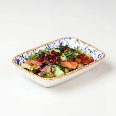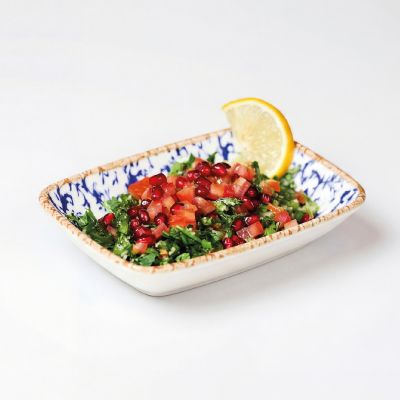 Fine bulgur, parsley, fresh mint, tomato, spring onion, pomegranate, cucumber, lemon juice, olive oil.