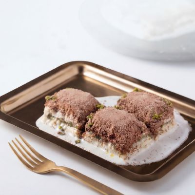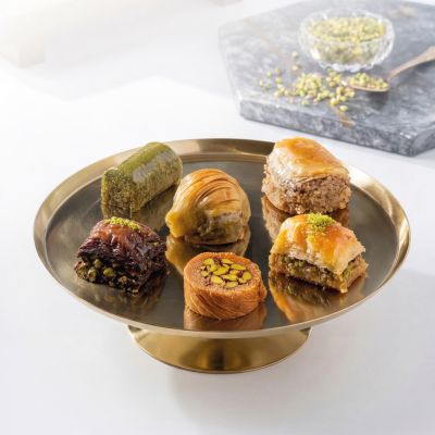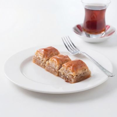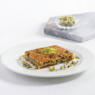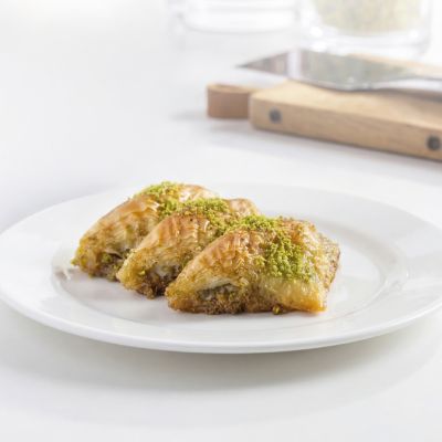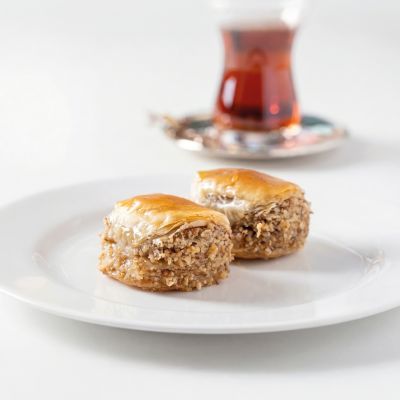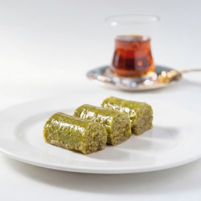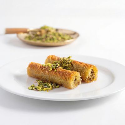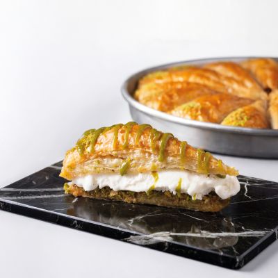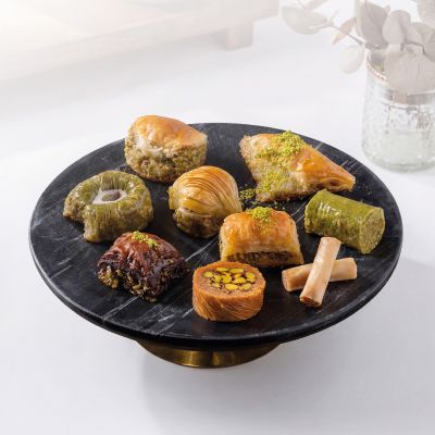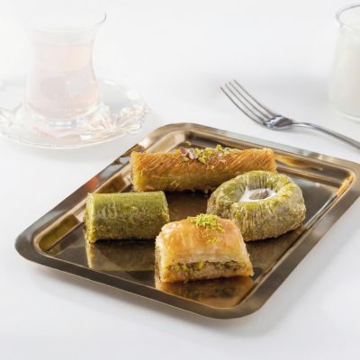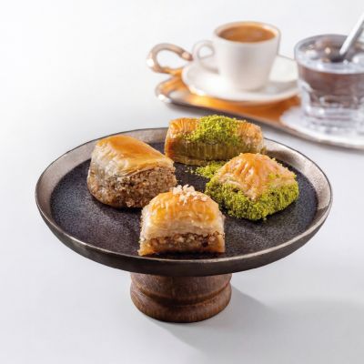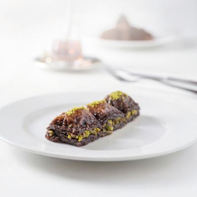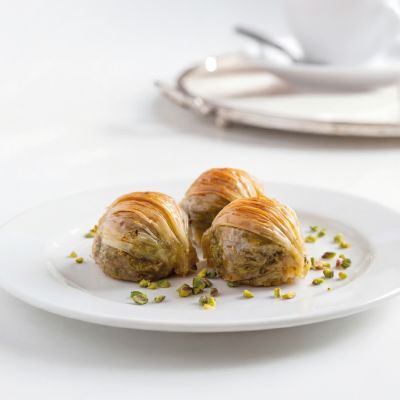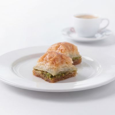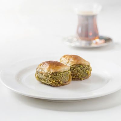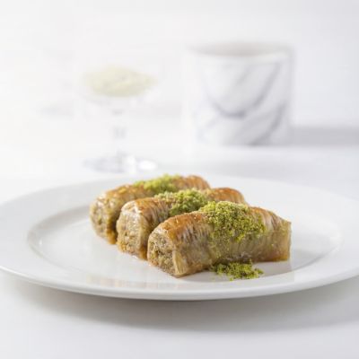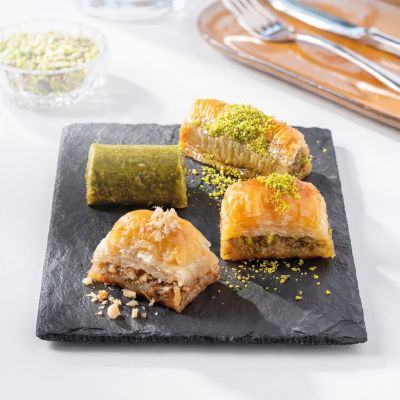 For connoisseurs: Our “Magnificent Nine” Assorted Baklava Plate... “Goddess’ Lips” w. pistachio, Creamy baklava w. pistachio, Nightngale’s nest baklava, “Moussel” baklava w. pistachio, Classic baklava w. pistachio, Pistachio wrap, Chocolate baklava w. pistachio, Pistachio Aleppo dessert and Finger baklava.