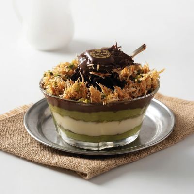 Crispy kadayif on top of chocolate, baked pastry cream and pistachio cream layers.