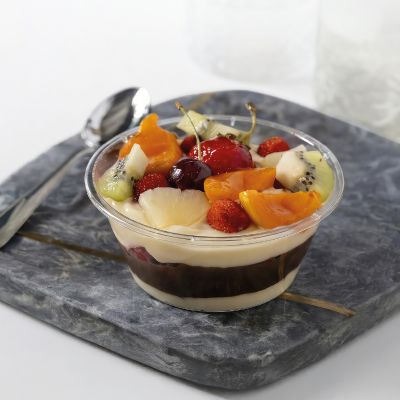 Assorted seasonal fruits and profiteroles sauce on top of a baked pastry cream.