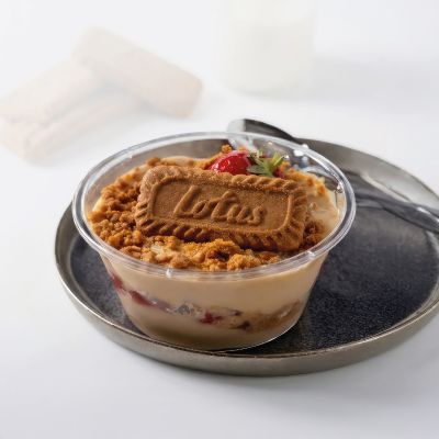 Strawberry, Lotus chips and profiteroles sauce on top of a baked pastry cream.