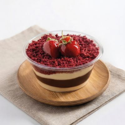 Strawberry and profiteroles sauce on top of a baked pastry cream.