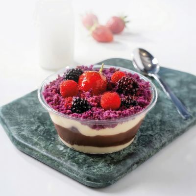 Strawberry, raspberry, blackberry and profiteroles sauce on top of a baked pastry cream.